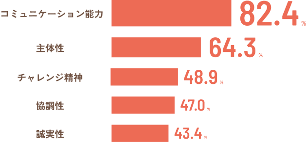 経団連「新卒採用に関するアンケート調査」(2018年度)によると、「選考にあたって重視した点」の1位はコミュニケーション能力82.4%、2位は主体性64.3%、3位はチャレンジ精神48.9%、4位は協調性47.0%、5位は誠実性43.4%と、企業は学力よりも人間力を求める傾向が強いです。